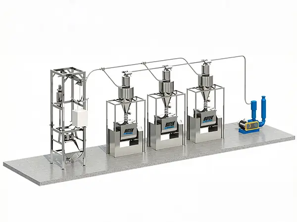 Automate your material transfer with a fully sealed system. Bulk Bag Unloader feeds directly into a vacuum conveyor, enabling gentle, long-distance transport of powders to multiple destinations.